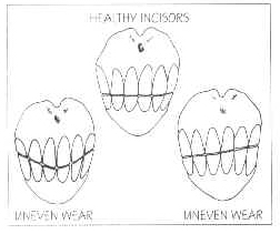 a relatively straight line (at a right angle to the horse's nose). Abnormal wear leaves the incisors uneven in