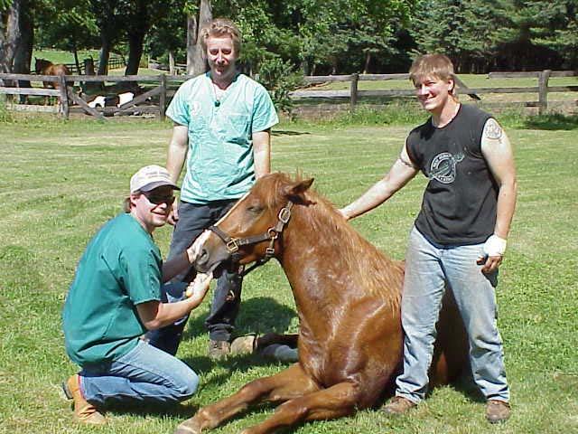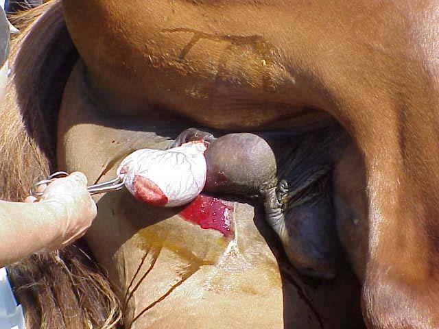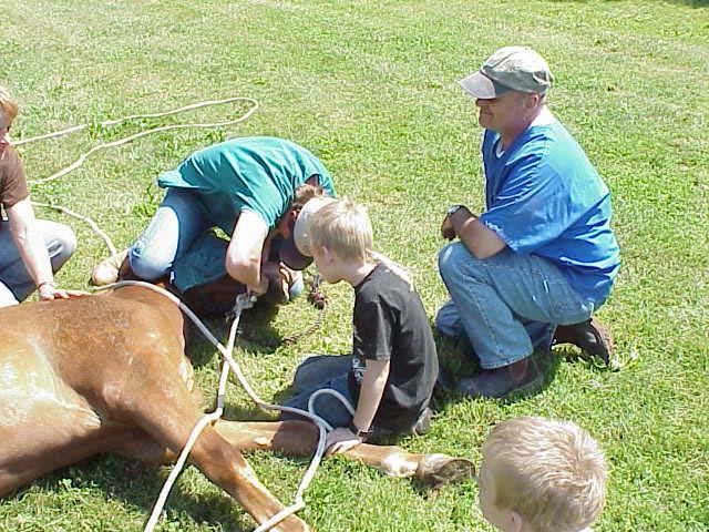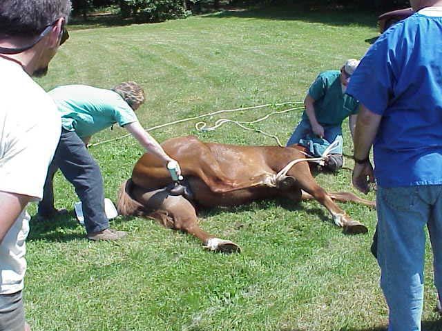 Dr. Hyde preparing castration site with students with horse under general anesthesia.
